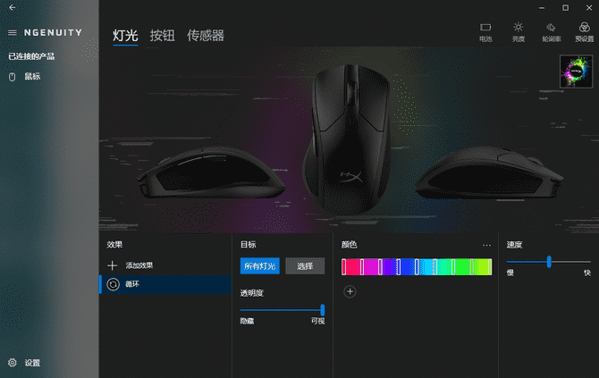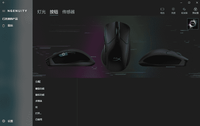 HyperX NGENUITY驅動已經支持多款HyperX產品,鍵鼠外設都可通過一個驅動進行設定,驅動共分為燈光、按鍵、傳感器三大部分,界面清爽、高效。頂部則能查看鼠標電量,以及調整亮度、回報率等參數。