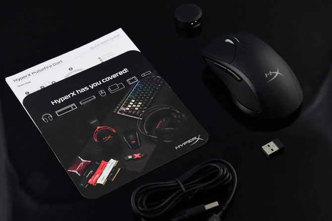 包裝方面依然是延續了HyperX外設的一貫風格,以紅白為主配色,正面印有產品多項賣點,配件部分附贈了一條Type-C線材、2.4G無線接收器,以及一個Type-C轉Type-A轉換器。