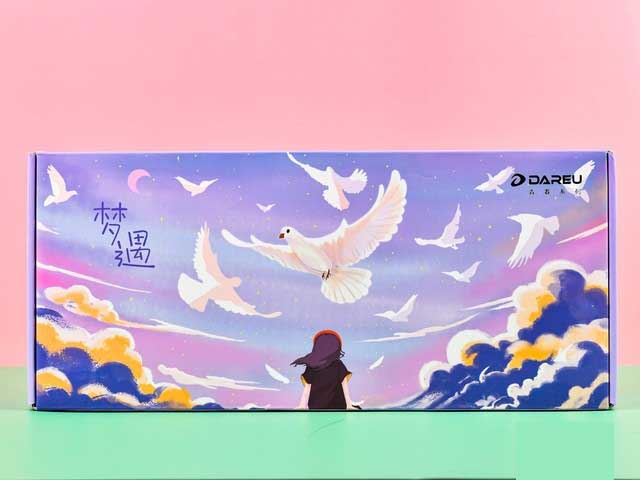 夢遇鍵盤的色調為神秘的紫色。從包裝上我們就可以看到,少女背對我們面朝色彩層疊的紫色天空以及空中飛舞著的自由的白鴿。這把鍵盤蘊含著青春時代最甜蜜的遐想,以及對世界懵懂的好奇探索。