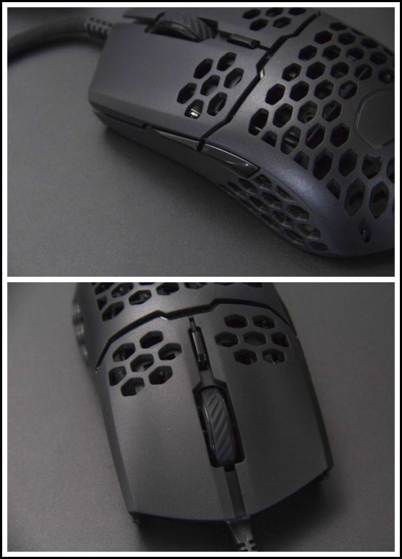 不知有密集恐懼癥的玩家們能不能接受這個天狼星的造型,鼠標上打孔的部位非常大,但是像左右鍵的前部和左右兩側前端這些手指接觸的部分沒有打孔,保證鼠標的手感不受影響。鼠標通體黑色,表面經過類膚質處理,舒服不打滑。而且打的孔的形狀也是酷冷至尊LOGO的輪廓,有點意思。