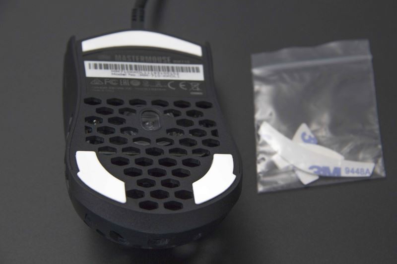 從底部看可以看到天狼星使用了原相PMW3389傳感器,這也是原形高端型號的傳感器,比如雷蛇的銳蝮蛇和Hyper的巨浪鼠標都用這顆傳感器。天狼星為玩家提供了200~32000DPI范圍調節,相信無論時專業電競選手還是普通玩家都能適用。大家也看到天狼星的腳貼是白色的,這是3M的特氟龍腳貼,表面非常光滑,在鼠標墊上移動阻力非常小,同時酷媽還準備了一副備用的腳貼。這個腳貼上覆著一層貼膜,用之前記得撕下來。