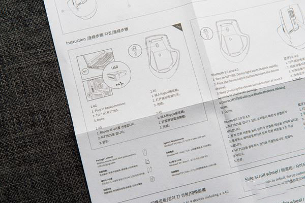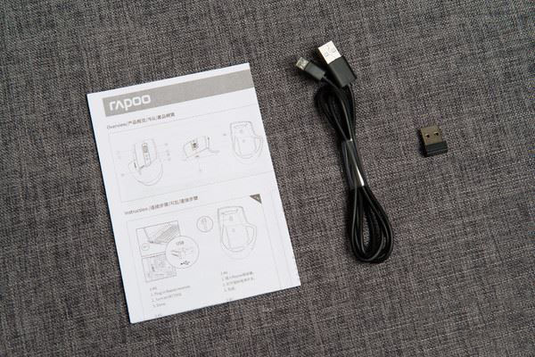 雷柏的內包裝比較環保,采用的是紙殼,紙殼內部的所有附件一覽,包含產品說明書、充電線和2.4G發射器。
