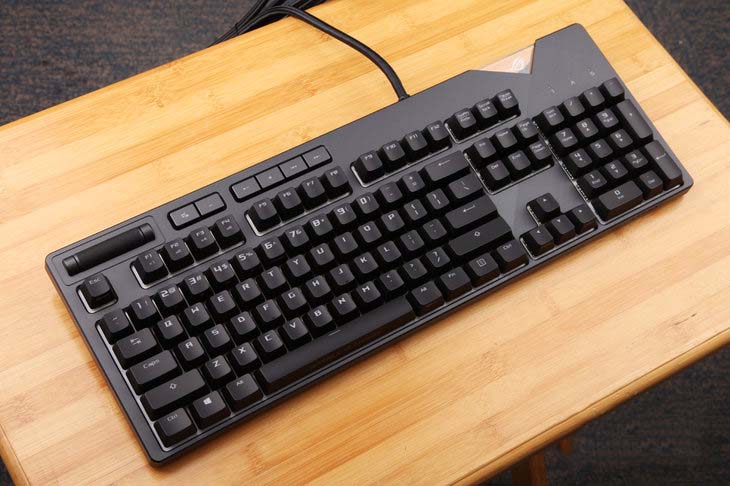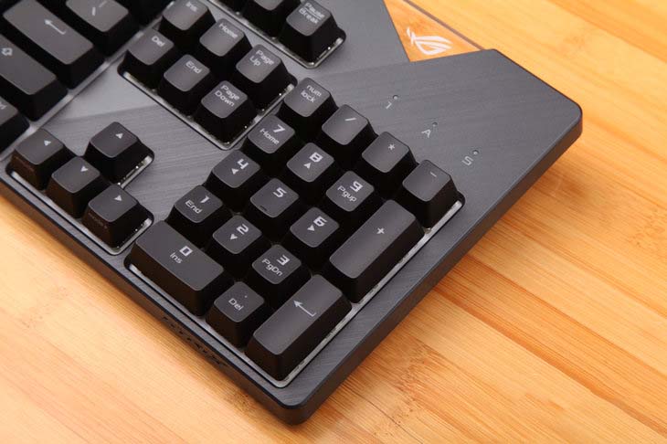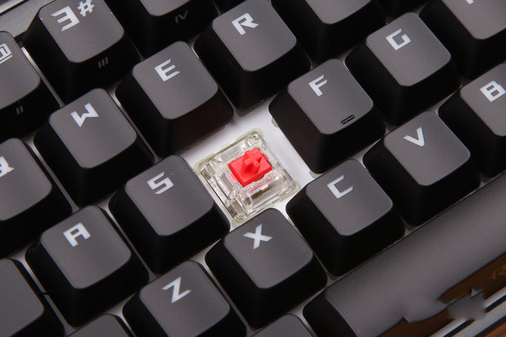 ROG STRIX FLARE機械鍵盤采用了104鍵的全尺寸鍵盤設計,“拉絲+微磨砂”的設計使用起來手感舒適。鍵盤三圍尺寸為:454 mm x 155 mm x 31 mm,重量僅為1256g,對比其他機械硬盤,重量上略輕一些。