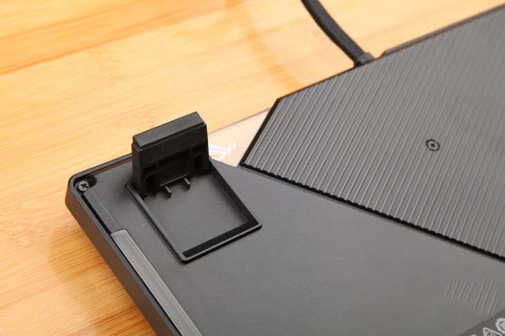 鍵盤背面有著五塊防滑橡膠墊,其中兩塊在支架腳上,鍵盤右側偏下的位置還有一個“敗家之眼”,這只可遠比正面透明亞克力板上的那塊要大的多。