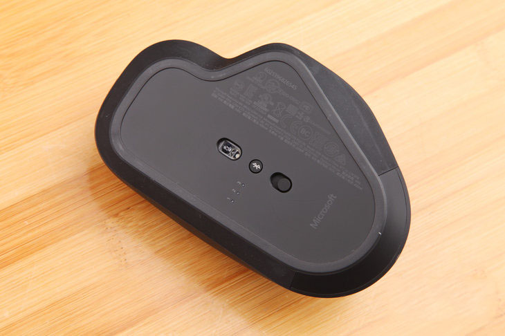 鼠標底部沿用了磨砂黑色的設計,底部一圈是鼠標的腳墊,鼠標中部是鼠標的主要功能區,集中了引擎窗口、藍牙按鍵以及指示燈還有鼠標的開關。