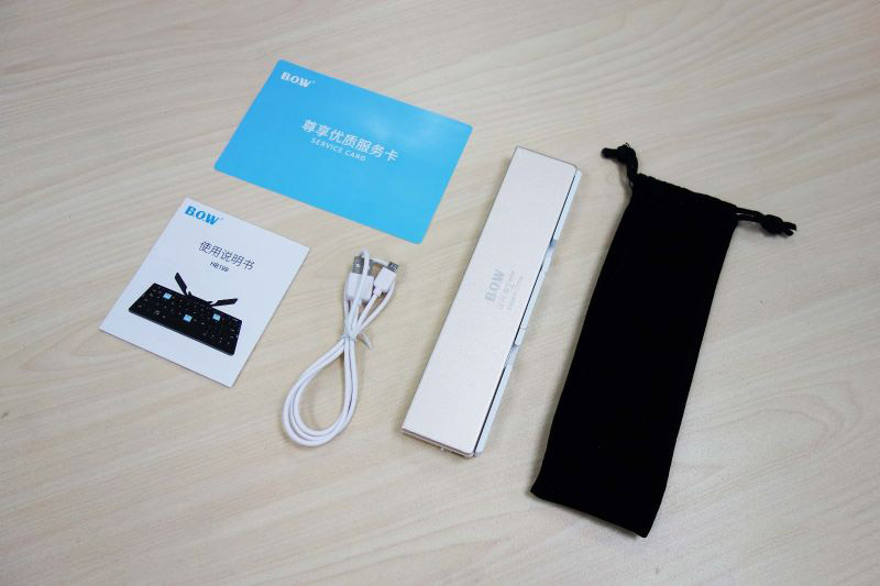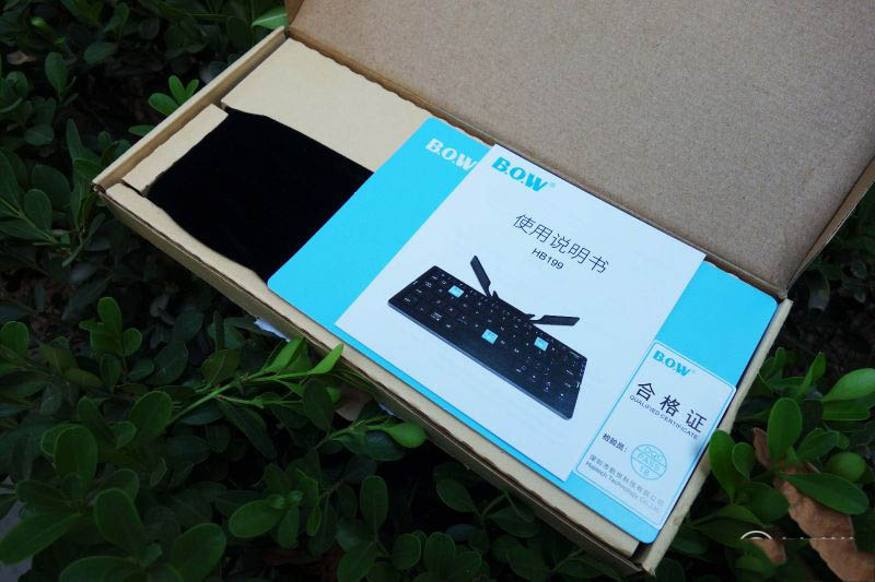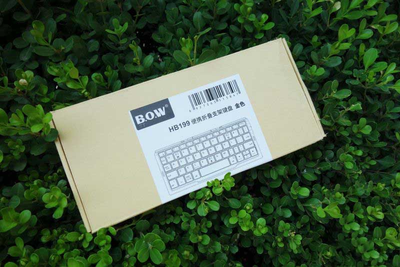 B.O.W 航世 HB199的產品包裝與其他電子產品華麗的外包裝有區別,素色的紙盒子正面貼了產品的具體型號。鍵盤的全稱是:航世HB199便攜折疊支架鍵盤,我買的是金色的。