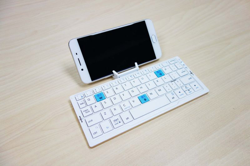 別小看這款藍牙鍵盤,古語有云:麻雀雖小五臟俱全。這款B.O.W 航世 HB199 折疊藍牙鍵盤的按鍵材質是ABS的,每一粒按鍵在敲擊的時候,給手指的反饋是非常輕柔的,就像巧克力鍵盤一樣。我們再來細看一下鍵盤的每一個按鍵上面藍色的多功能標注,多功能快捷按鍵可以說給了鍵盤給多的命令,這讓我們在外出辦公時,不至于嫌鍵盤小,而缺失了很多的功能鍵。在鍵盤的右頂端,從上至下依次是電源指示燈,藍牙123指示燈,燈小而不刺眼。