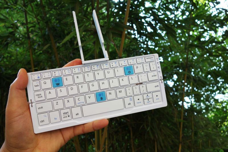 千呼萬呼始出來,從上向下翻折一下,我們就能看到這款超級便攜的航世HB199的廬山真面目了。鍵盤的格局是采用標準的鍵盤格局,鍵盤的按鍵上做了很多天空藍的標注,其中最引人注目的是WOB這三枚按鍵,它們三者使用了天空藍的按鍵鍵鈕,為何選擇它們三呢?組合一下,B.O.W 航世 ,其實就是航世品牌的英文簡稱。