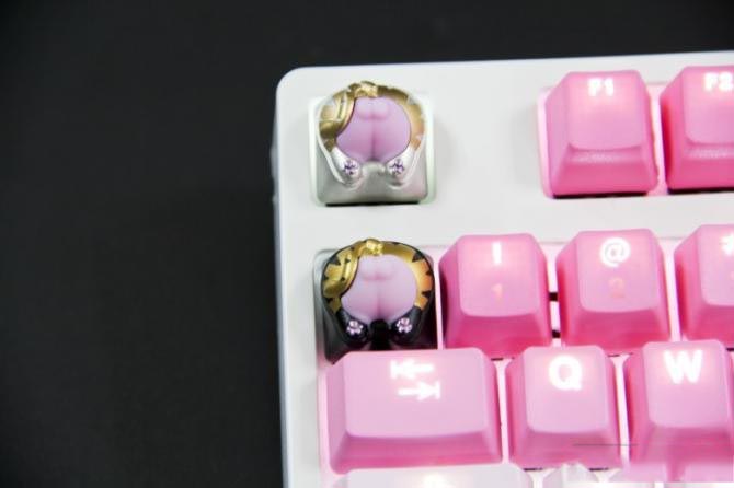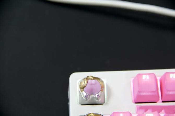 在安鍵帽前沒留意將鍵帽靠在了冰凍飲料上,結果發現貓屁屁都已經粉紅的發紫了……略尷尬。就接觸面積來說,之前的貓爪鍵帽的柔性材料接觸面積比貓屁屁的要稍大些,但是貓屁屁的手感要比貓爪更加柔軟更有彈性。貓爪和貓屁屁鍵帽都采用了鋁合金鍵帽本體,表面采用三次陽極氧化上色技術,如此復雜的工藝保證日常使用不會掉色。