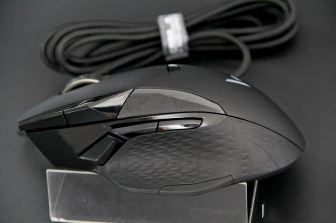 鼠標的左右側貼近手掌虎口和無名指小指的部分大量采用了立體紋路的橡膠材質。這兩部分也是我們握鼠標時穩定鼠標的關鍵部位,所以這兩塊地方使用橡膠材質用于疏汗和防滑。側面還有三個側鍵,玩家可以通過配套的驅動軟件自定義功能,三個按鍵數量也足夠滿足大多數MOBA玩家的需求。