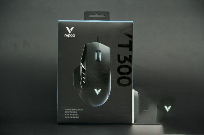 雷柏VT300電競游戲鼠標包裝正面印著鼠標產品圖和產品型號,簡單明了。黑色包裝看上去沉穩大氣。