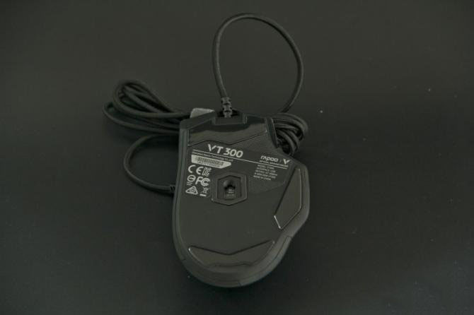 底部有上下右三片大面積腳墊,VT900的配重倉設計不見了,因為VT300采用了內置配重,配重塊在背部頂點的位置,鼠標重量有110g,男性玩家們應該覺得重量適中。傳感器方面采用了PMW3327游戲級傳感器,DPI范圍從200-6200,最高加速度30G,220IPS。