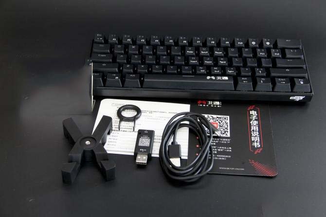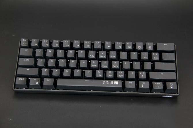 乍一看是不是覺得北通K1有點小,沒錯,北通K1采用了61鍵的鍵位布局,玩家會想61鍵的鍵盤不是很雞肋嗎?其實北通在在61鍵上做到了87鍵的功能,鍵盤上部分按鍵包含了二級功能鍵位圖中的白色字體,便代表了該鍵位的二級功能,玩家只需在按住FN功能鍵的同時,去點擊這些按鍵,即可使用鍵位二級功能,使得整個鍵盤體積不至于很大。