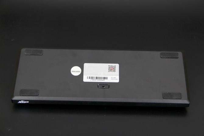 北通K1背面有四角均有防滑膠墊,因為鍵盤本身就已經有一個傾斜度了,所以鍵盤上并沒有設置折疊的支撐腳。中間是鍵盤的開關,上面還有防偽碼以供查詢真偽。