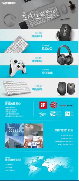 雷柏不斷在向智能化、專業化、全面化發展,遍布全球51個國家,5000多萬用戶,連年受邀參加美國CES、德國IFA等全球性消費大展,綻放中國智造力量。德國IF設計大獎、德國紅點設計大獎、亞洲最具影響力設計獎DFA、中國設計紅星獎、中國臺灣金點設計獎、日本G-Mark設計獎等各項榮譽的加冕,是對雷柏打造的獨特性能系統、時尚藝術美感的最好注解。