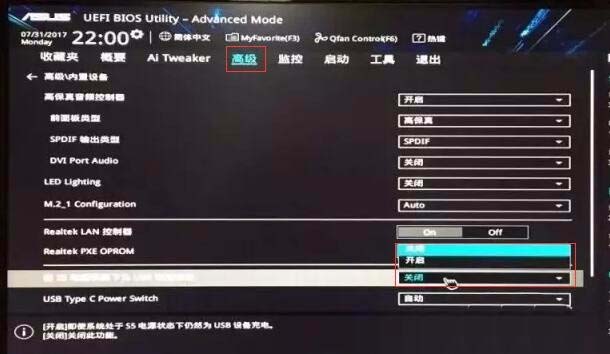 【高級模式】->【高級】->【內置設備】->【在S5電源狀態下為USB設備充電】