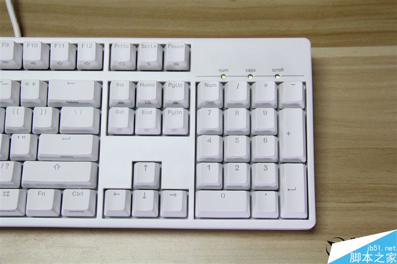 ↑↑↑鍵盤指示燈位于右上角,內(nèi)部采用了白色LED,開啟后的燈光效果與鍵盤整體協(xié)調(diào)統(tǒng)一??粗鳪104純白的外觀,筆者瞬間萌生了要給它加上白色背光的沖動,因為PCB上貼心的預(yù)留了燈位和焊盤,加燈作業(yè)變得非常容易。