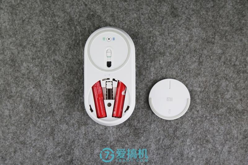 下方圓圈是一個(gè)旋轉(zhuǎn)式后蓋,開(kāi)啟方式非常簡(jiǎn)單,內(nèi)置了兩顆來(lái)自紫米的7號(hào)電池,同時(shí)里面還有一個(gè)2.4GHz 的接收器,用于插在電腦的 USB 端口上使用。