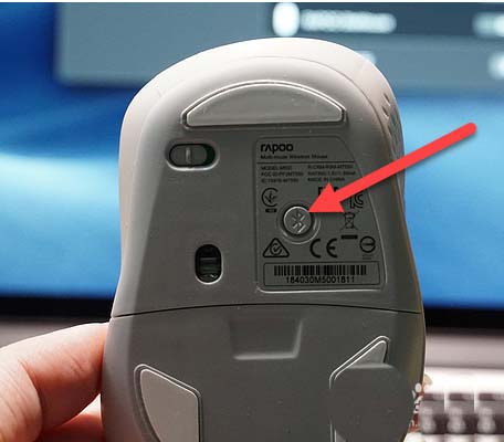 3、長按鼠標背面“藍牙”按鈕,進入配對狀態。(M500可以接入三臺設備,每臺設備都配對成功后,短按此按鈕,可以在不同設備之間切換)