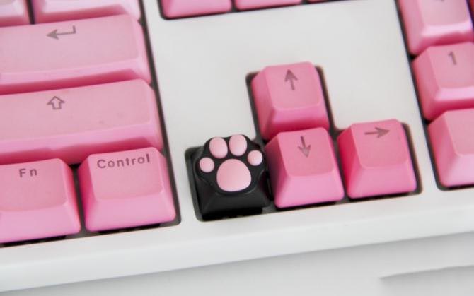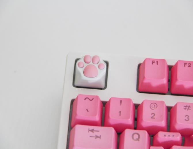 這三顆貓爪鍵帽和之前的吃雞三件套鍵帽不同,吃雞三件套的鍵帽形狀并不是那么的規則,并且高度也不一樣,如果當作常用按鍵來按的話手感總會有些怪怪的,比較適合放在不常用的鍵位做裝飾用。而這三顆貓爪鍵帽整體造型比較規整,而且高度和普通鍵帽大致相當,所以就算是放在常用按鍵上也不會影響手感。并且貓爪上的硅膠按上去軟綿綿的,感覺非常奇妙。