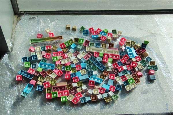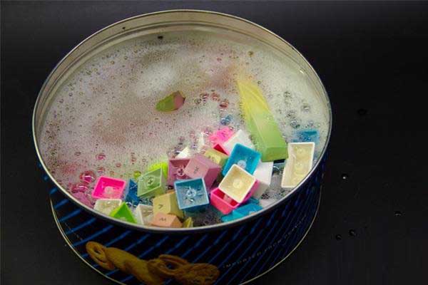 首先是鍵帽部分,由于機械鍵盤的鍵帽并沒有電路裝置,同時鍵帽的顏色和字母都是經過特殊工藝印染上去的,并不怕水。于是,小編就可以很方便很粗暴的將兩把鍵盤所有的鍵帽全部拔下來,并且集中到容器中,加入足量的水,以及用于清理污漬的洗潔精,進行浸泡去污。