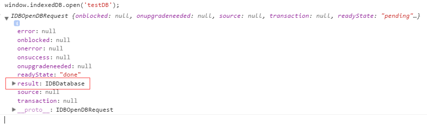 在 IndexedDB 大部分操作并不是我們常用的調用方法,返回結果的模式,而是請求――響應的模式,比如打開數據庫的操作: