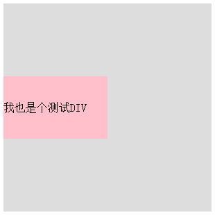 <div id="box"> <div id="child">我也是個測試DIV</div></div></pre>css代碼:#box { width: 300px; height: 300px; background: #ddd; position: relative;} #child { width: 50%; height: 30%; background: pink; position: absolute; top: 50%; margin: -15% 0 0 0;}運行結果如下: