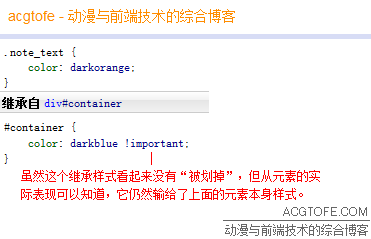 而且,繼承樣式是最低優先級這一點,是無視繼承樣式所在的樣式規則的內容的。這就是說,繼承樣式所在的樣式規則,即使其選擇符的權重比元素本身樣式的選擇符的權重更高(本文后文會介紹選擇符權重~ :) ),甚至繼承樣式被寫了!important,繼承樣式會被元素本身樣式覆蓋這一點仍然成立。