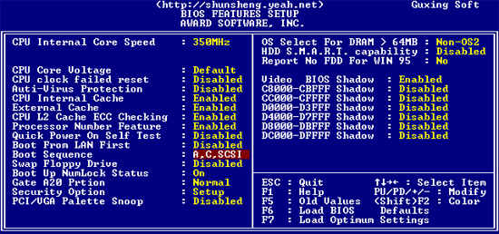 BOOT SEQUENCE(開機優(yōu)先順序)這是我們常常調(diào)整的功能,通常我們使用的順序是:A、C、SCSI,如果您不需要從A盤啟動,那么可以調(diào)整為ONLY C ,即只從C盤啟動。
