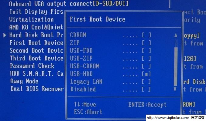 B、設置計算機從USB啟動方法:可以選擇USB-HDD或USB-ZIP(根據USB啟動盤類型確定),首先選擇First Boot Device,然后會彈出一個設備選擇框,里面有幾個選項(如下圖),一般選擇USB-HDD即可(視乎USB啟動盤的類型)。
