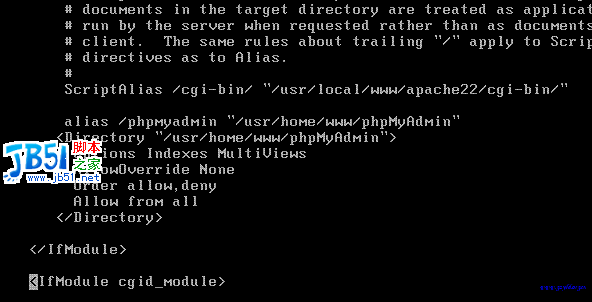 為了用http://192.168.1.109/phpmyadmin進入管理界面(本機IP),我們還需要在apache22配置文件httpd.conf中設置虛擬目錄。在httpd.conf中找到<IfModule alias_module>這行,在后面添加: