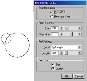 Freeform工具的對知框有兩個選項,分別代表兩種操作方式:推拉操作(Push/Pull)、區域整形(Reshape Area),其中各自的參數設置都簡單明了,如圖所示 。