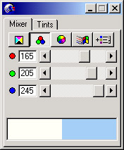 接下來是上色,點擊矩形行使之被選中。分別單擊Window菜單>Panels>Color Mixer和Color List命令,調出調色板和顏色列表兩個面板(您也可以用快捷鍵Ctrl+Shift+9和Ctrl+9調用它們)。在調色板面板(Color Mixer)的Mixer子面板中選擇RGB配色方案,分別設定R=165(紅),G=205(綠),B=245(藍),如圖十四所示,我們得到了實例中的那個較深的天藍色。然后把這個顏色從預覽框拖到Color List面板中Color子面板的新色框 中,Color子面板的顏色列表中就出現了這種新顏色,如圖十五所示。再選中整體填充按鈕(第三個按鈕),選擇新加入的顏色。這時我們可以看到這組矩形都變成了天藍色。