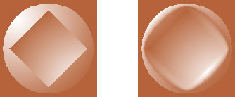 步驟三:現(xiàn)在我們來做一個(gè)復(fù)雜些的例子,在不同形狀的對(duì)象間創(chuàng)建混合,創(chuàng)建一圓形一矩形兩個(gè)對(duì)象,都添加輻射漸變填充。分別調(diào)整它們漸變的中心點(diǎn),如上圖所示。將兩者進(jìn)行混合,最后形成非常漂亮的凹凸效果。