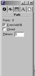 路徑面板:如果一條路徑被選時(shí),這個(gè)面板會(huì)出現(xiàn)。它提供Points(點(diǎn),顯示路徑上節(jié)點(diǎn)的數(shù)目)、Even/odd fill(奇/偶填充,當(dāng)路徑為封閉路徑時(shí),這個(gè)選項(xiàng)控制是否將路徑中的相交部分挖空)、Close(閉合,這一項(xiàng)控制是否將路徑封閉,選中該項(xiàng),F(xiàn)reehand會(huì)自動(dòng)連接路徑的兩個(gè)端點(diǎn),連接端點(diǎn)的線段的曲率由端點(diǎn)的性質(zhì)決定,當(dāng)然,如果在路徑封閉的情況下選擇此項(xiàng),F(xiàn)reehand會(huì)自動(dòng)刪除路徑的最后一段使路徑變?yōu)槌ㄩ_)、Flatness(平滑度,這一項(xiàng)控制路徑的平滑程度,但這一項(xiàng)設(shè)置的效果只能在打印中才能看到,計(jì)算機(jī)屏幕上是無(wú)法觀察到的)。