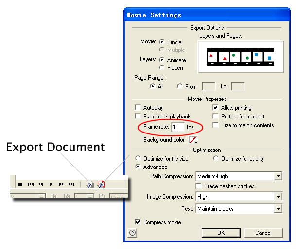 4)和Flash里一樣,按Ctrl+Enter進行動畫測試,是不是看到兩個形狀之間的變形動畫了?如果沒有動,注意屏幕左下角還有東西,相信你一眼就可以找到播放圖標。值得一說的最右邊的兩個圖標,一個是“Exprot Document”,用來導出文件(動畫或圖片);另一個是“Movie Settings”,動畫設置,一般默認即可,紅圈里是播放速度,和Flash的默認幀數是相同的。