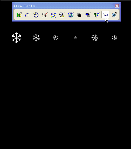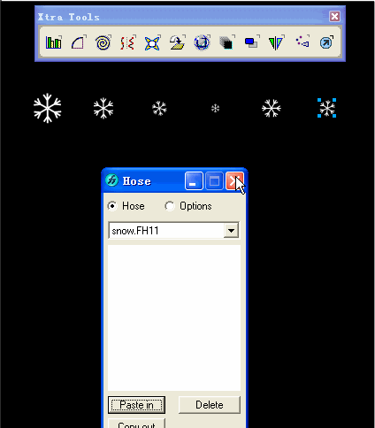 將雪花全部貼入后,關閉噴管面板,再次選擇噴管工具,在黑色背景上按下鼠標左鍵不放,畫出一個任意形狀來,大小不一的雪花從鼠標下噴出,很好玩的。你也可以一朵一朵的噴,方法是一下一下的按鼠標左鍵。這個工具在畫樹葉、草地、下雪天等畫面時特別有用。