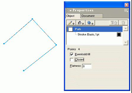 有不少朋友畫好封閉曲線后發現無法填充,用放大鏡放大觀察才發現某處節點是斷開的,也就是說所畫的對象其實是個開放曲線。即使我們很仔細的來畫,也還是難免這個情況的,這時我們就用到了對象面板。如圖,畫一個圖中所示的圖形,很明顯的開放曲線,再調出FH的對象面板,選中下方的Closed選項,看看剛畫的開放曲線發生什么事了?自動把第一個節點和最后一個節點用直線連接了。在你畫好一個圖形時,可以查看對象面板的Closed選項是否被自動選中,如沒有,說明你畫的對象未能封閉,可以用上述方法封閉之。