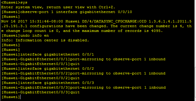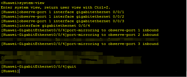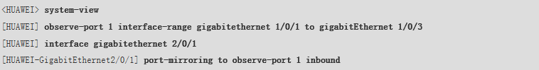 4、多個鏡像端口對應一個端口。將鏡像端口GE0/0/1~GE0/0/3入方向的報文(即接收到的報文)復制到觀察端口GE0/0/10上,GE0/0/10與監控設備直連。