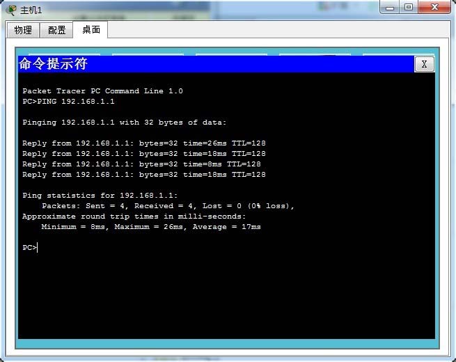 5、在主機1上進行Ping測試,ping 192.168.1.1,發現是連通的