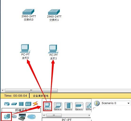 2、我們選擇【終端設備】拖動兩臺臺式機到工作區, 用于測試通信