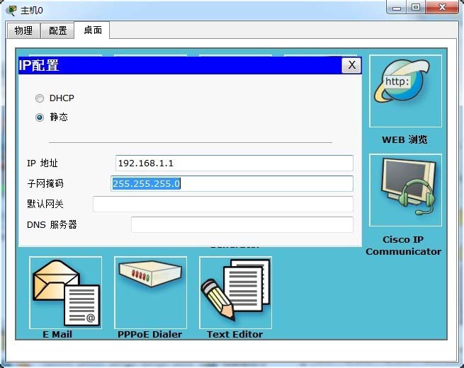 4、分別設置兩臺主機的IP地址,主機0為:192.168.1.1;主機1為:192.168.1.2