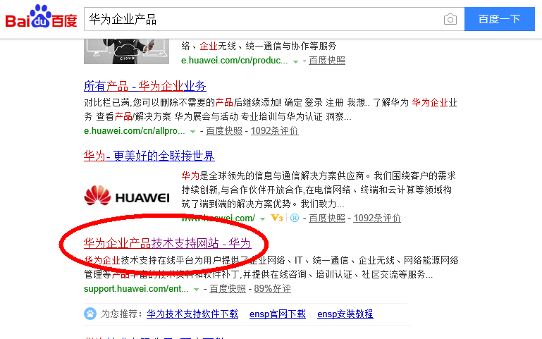 2、再打開百度搜索引擎,輸入“華為企業(yè)產(chǎn)品”,進(jìn)行百度搜索,搜索結(jié)果中找到“華為企業(yè)產(chǎn)品技術(shù)支持網(wǎng)站”