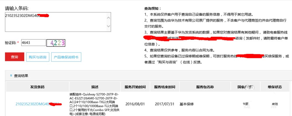 4、輸入華為交換機(jī)上的序列號及驗(yàn)證碼,點(diǎn)擊查詢,如果產(chǎn)品是正品,在下面即可查詢出交換機(jī)的保修時間