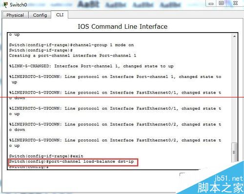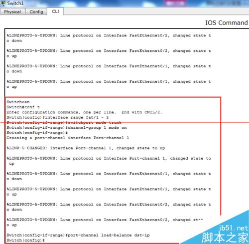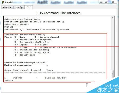 3、將fa0/1和fa0/2加入鏈路組1并開啟----按照目標主機地址IP數據分發來實現負荷平衡----通過show etherchannel summary來查看聚合口配置情況。