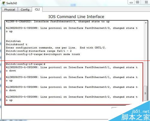 2、選擇交換機switch0進行配置----進入特權模式,將fa0/1和fa0/2端口模式配置成trunk。