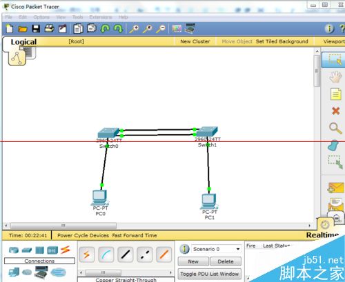 1、打開cisco模擬器---選擇交換機s2960、直連線、服務器像如圖連接起來。