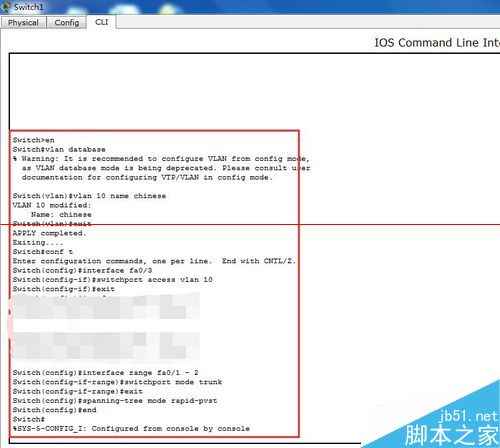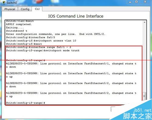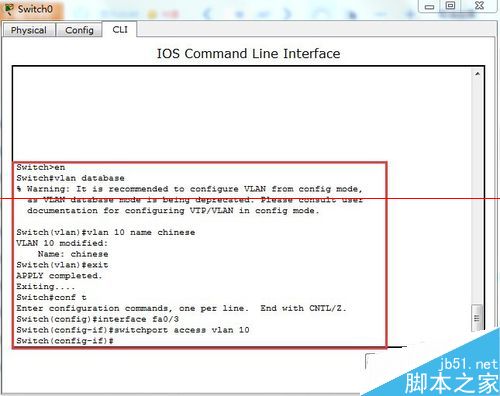 3、配置交換機switch1---在特權模式下生成vlan 10---進入fa0/3中的端口模式,將fa0/3配置到vlan 10中(由于端口默認模式為access所以不需配置)----將fa/1和fa0/2配置模式為trunk