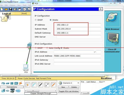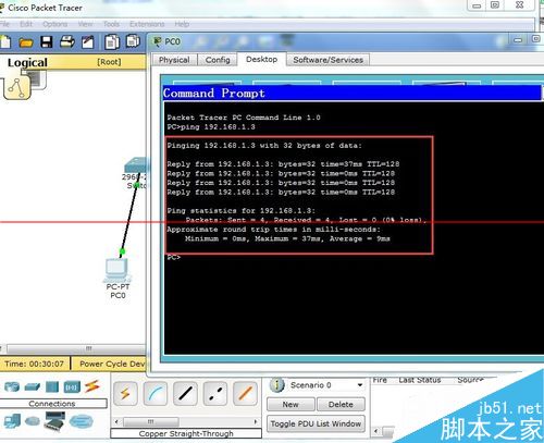 1、打開cisco模擬器,按照如圖方式連接服務器和交換機。