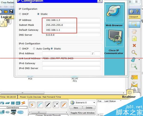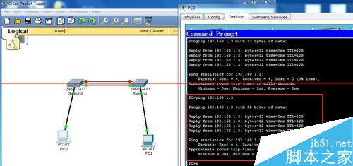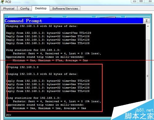 2、pc0IP配置為192.168.1.2子網掩碼配置為255.255.255.0網關配置為192.168.1.1,pc1IP配置為192.168.1.3子網掩碼配置為255.255.255.0網關配置為192.168.1.1---pc0 ping pc2可以ping通。